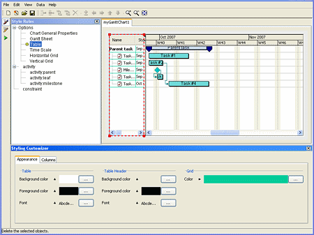 Designer for JViews Gantt, a point-and-click editor for specifying most aspects of the display, including the data source and the "rules" for defining how the chart will appear on the screen under different data conditions;