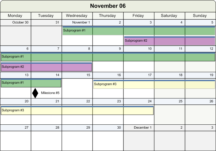Activity bar charts can display the relationship of activities to absolute or relative horizontal time scales. In contrast, activity calendar views display the relationship of activities to absolute dates and times arranged in a monthly or hourly grid. This type of chart is useful for showing how activities relate to weekends, holidays, and other milestones that are external to the project schedule.