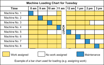 Charts for showing the work assigned to a resource, such as a person or a machine, represent the loading of that resource. A blank cell indicates that nothing is assigned to a resource in the given period. A filled cell shows that work has been assigned to the resource. The objective is often to achieve maximum utilization of resources, with every cell filled.