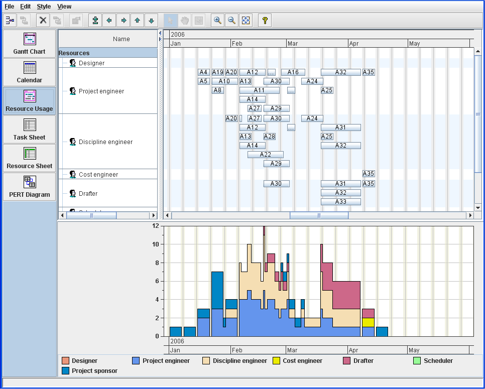 <installdir>/jviews-gantt/samples/ganttViewer/src/ganttviewer/GanttViewer.java demonstrates a complete planning application that includes an activity-based Gantt chart, a resource-based Gantt chart integrated with a Resource Data chart to show the loading of resources, a monthly Calendar view, a task sheet, and a resource sheet.