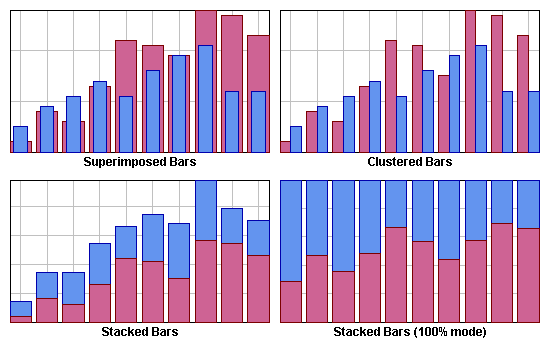A bar chart renderer supports five representation modes: Superimposed, Clustered, Stacked, Stacked100, and Stacked Diverging.