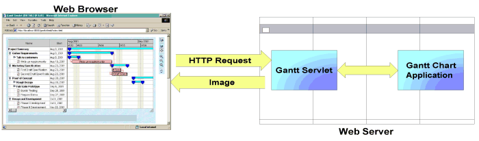 For the predefined Gantt JavaScript™ Web application, the content created by the servlet is primarily a JPEG or PNG image. The servlet generates the images from a Gantt chart server-side application, acting as an intermediate layer. It interprets the HTTP requests from the Web application running in the user’s browser, generates images of the Gantt chart server-side application, and delivers the images in HTTP responses back to the client. In turn, the Gantt chart server-side application may obtain the scheduling information that it displays from XML files, databases, or other application-specific data. This basic architecture is illustrated in
