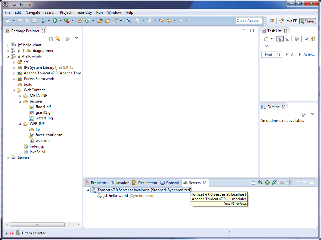Copy the file java2d.ivl and the folder textures from <installdir> \jviews-framework\codefragments\jsf-hello-world\webpages to the WebContent folder of your project. The location of this example might change depending on the version of your JViews product.