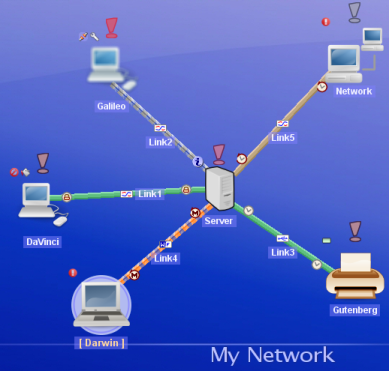 For domains where the graphical representation should be less constrained and possibly more attractive, JViews TGO offers different ways to enrich the default look and feel. For example, it is very easy to define new icons for some kinds of node or state, or to define a specific representation for a given router when it does not work properly. In contrast with demanding network management activities, this is particularly suitable for network and asset visualization for which there is less precise information to display but in a more attractive way. This type of configuration can be performed through Java™ code using the open API of JViews TGO, or through configuration files based on the Cascading Style Sheets (CSS) syntax. So it is possible to describe the mapping between information and its desired visual representation, and allow developers to reuse and share the newly-defined look and feel between many different applications. Here is a typical example of a custom look and feel: