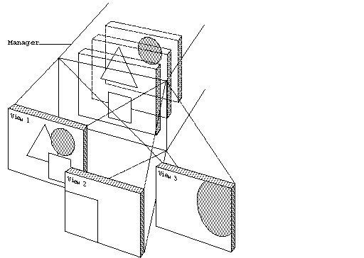 A manager organizes graphic objects in multiple storage places and coordinates the interactions between the display of graphic objects in multiple views, as illustrated in the following figure.