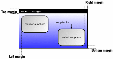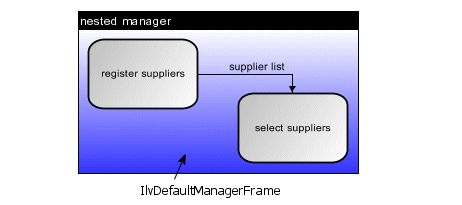 The frame around a nested manager is defined by the interface IlvManagerFrame. The IlvManagerFrame interface defines the margin that will be added around the manager. It defines how the frame is drawn and how hit testing on the frame is performed.