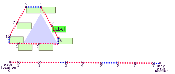 In the following figure, the upper diagram shows the path around the triangle (the dashed red and blue line). Below, you can see the same path rolled out in one dimension. The Annealing Label Layout may ask the label descriptor to place the label at position 1 to 8. For the Annealing Label Layout, these positions are just numbers between 0 and maxPathLocation. The task of the label descriptor is to translate these numbers into the correct positions as shown in the upper part of the figure.
