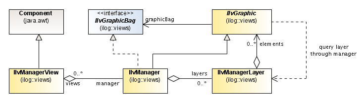 The following UML class diagram summarizes the relationships between IlvManager, IlvGraphic, IlvManagerLayer, and IlvManagerView.