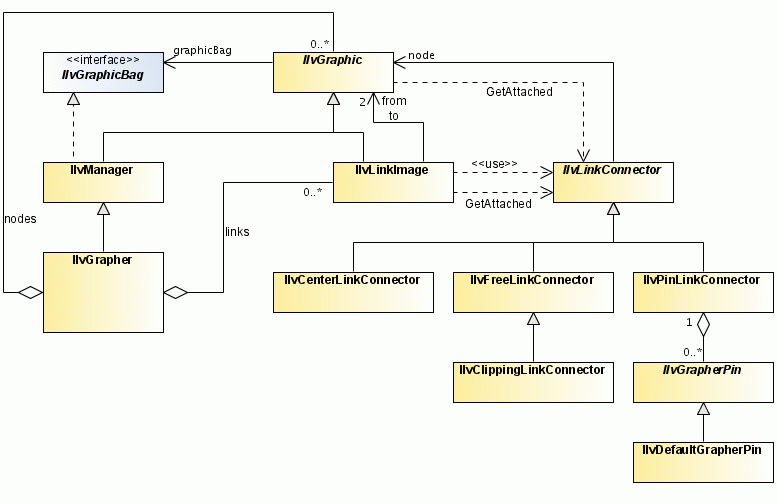 The following UML class diagram summarizes the relationships between IlvGrapher, IlvGraphic, IlvLinkImage, and IlvLinkConnector.
