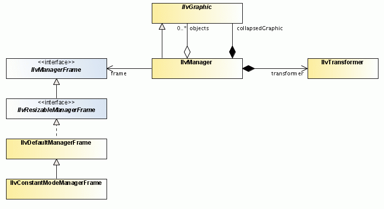 IlvManager is a subclass of IlvGraphic; since IlvManager can contain IlvGraphic instances as objects, it is possible to nest managers in other managers. When you display the nested submanagers, the content is drawn and transformed using a local IlvTransformer instance in the submanager. For the top-level manager displayed in the manager view, the local transformer plays no role since the top-level manager is drawn and transformed by that view’s IlvTransformer.