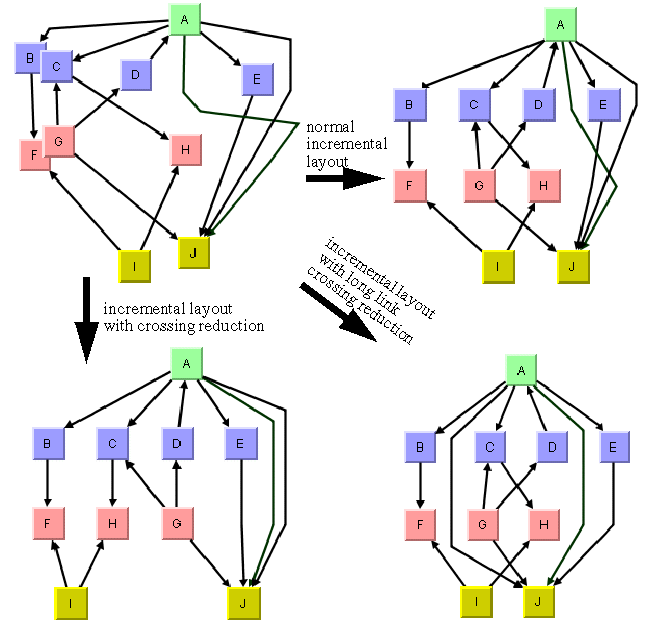 The algorithm tries to minimize the number of link crossings (which is generally an NP-complete problem). It is mathematically impossible to solve this problem quickly for any graph size. Therefore, the algorithm uses a fast heuristic that obtains a good layout, but not always with the theoretical minimum number of link crossings.