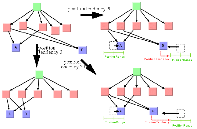 You can set parameters for the steps of the layout algorithm in several ways. For instance, you can specify the level index that the algorithm must choose for a node in Step 1 or the relative node position within the level in Step 2. You can also specify the justification of the nodes within a level and the style of the link shapes.