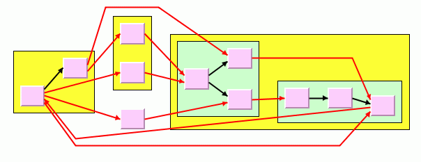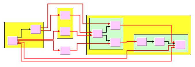 A graph that is a node in another graph is called a subgraph. Links that connect nodes of different subgraphs are called intergraph links. In Recursive hierarchical layout on nested graph with polyline link style, all red links are intergraph links and all black links are normal links. This is explained in detail in Nested layouts.
