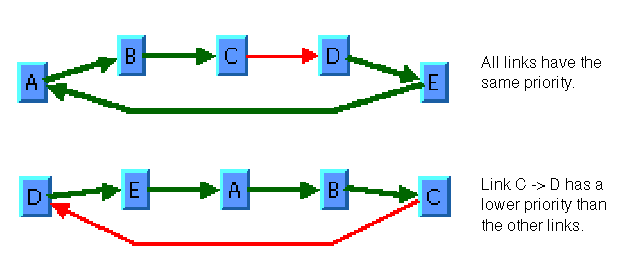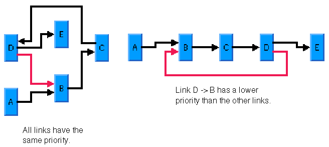 The algorithm tries to place the nodes such that all links point uniformly in the same direction. It is impossible to place cycles of links in this way. For this reason, it sometimes produces a graph where few links are reversed to point into the opposite direction. The algorithm tries to minimize the number of reversed links (which, again, is an NP-complete problem). Therefore, the algorithm uses a fast heuristic resulting in a good layout, but not always with the theoretical minimum number of reversed links.