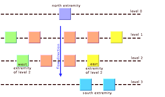 From the level indexes and position indexes, balanced coordinates for the nodes are calculated. For instance, for a layout where the link flow is from top to bottom, the nodes are placed along horizontal lines such that all nodes belonging to the same level have (approximately) the same y-coordinate. The nodes of a level with a smaller index have a smaller y-coordinate than the nodes of a level with a higher index. Within a level, the nodes with a smaller position index have a smaller x-coordinate than the nodes with a higher position index.