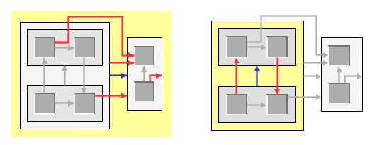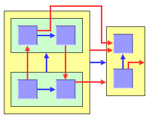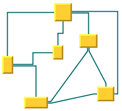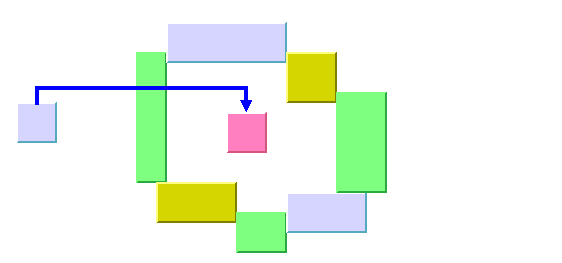 In long link mode, link crossing cannot always be avoided. Segments of orthogonal links that overlap are always avoided unless there is no free space remaining on the border of the end nodes. Any overlapping of nodes and links is always avoided unless one end node is inside an enclave. An enclave is an area that is surrounded by other nodes such that the area cannot be reached from the other end node, see A node inside an enclave.