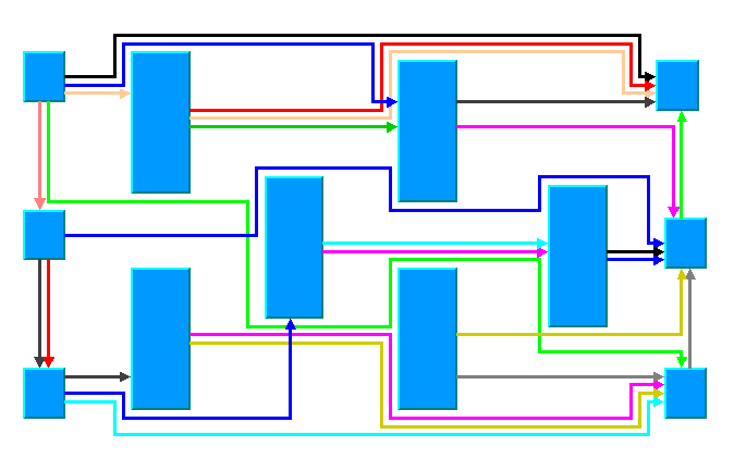 As mentioned in Long Link Layout algorithm, the algorithm first treats each link individually and then applies a crossing reduction phase to all links. To find a route for an individual link, the algorithm first checks whether a routing (such as a straight line or with only one bend) is possible. If this type of routing is not possible, it uses a sophisticated, but more time consuming, grid search algorithm with backtracking to find a route with many bends.