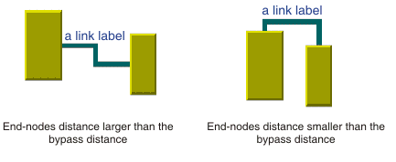 The bypass distance is the minimum distance between the origin and destination nodes for which a link shape going directly from one node to another is allowed. The algorithm tries to avoid link shapes that connect directly the sides of the end nodes that are closer than the bypass value.