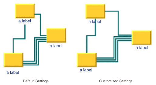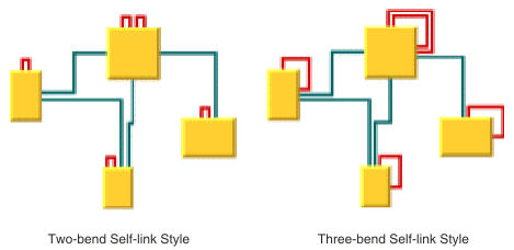 Self-link style options shows the effects of customizing the connection box. On the left is the result using the default settings: the connection points are distributed on the bounding box of the node (which includes the label) and are symmetric with the middle of each node side (including the label). On the right is the result after specifying a link connection box interface. On the lower side of the nodes, the links are now connected to the node (passing over the label), while on the left and right sides of the nodes, the connection points are now symmetric to the middle of the node (without the label).
