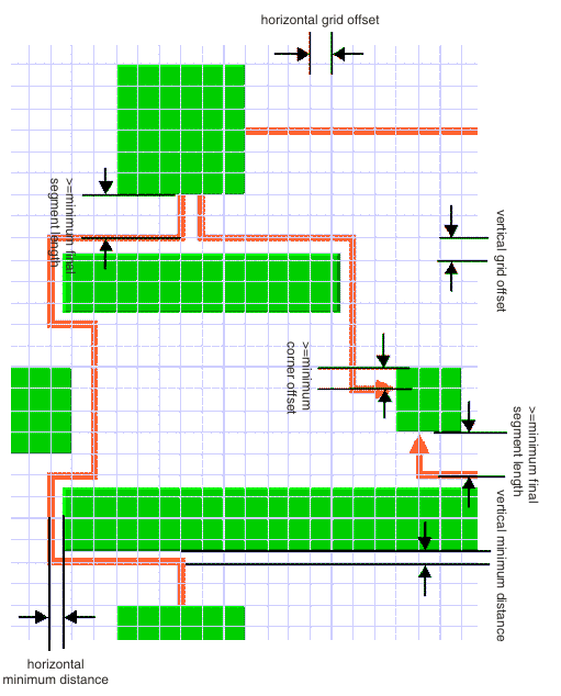 If the termination points of the links are not fixed, the algorithm uses a heuristic to calculate the termination points of each link. It examines all free grid points that are close to the border of the start and end node and assigns a penalty to each grid point. If a node-side filter is installed, the penalty depends on whether the node side is allowed or rejected.