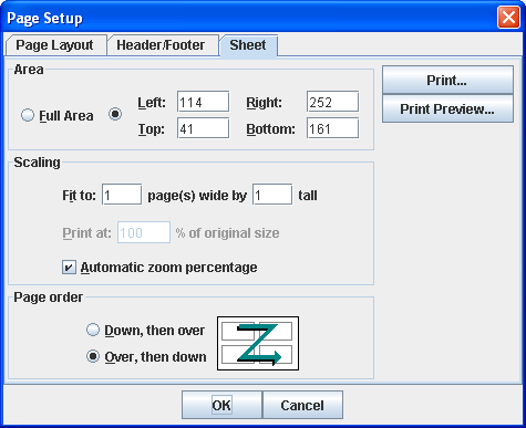 All properties of the IlvManagerPrintableDocument class can be specified by a dialog box (class IlvManagerDocumentSetupDialog). This dialog box, a subclass of the generic IlvDocumentSetupDialog, contains an additional page in the tabbed pane that allows you to specify the area to print, the number of columns and rows (that is, the number of pages), the zoom level at which to print, and the page order for the numbering of pages.
