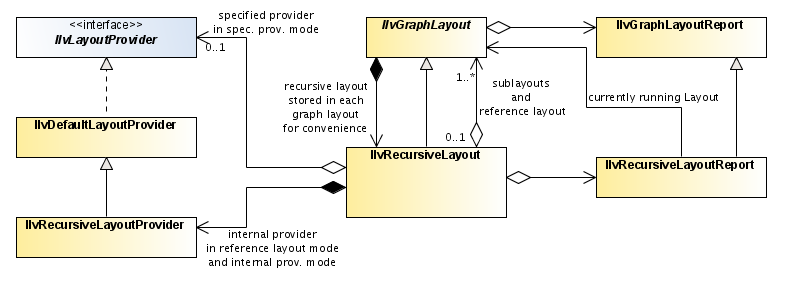 This layout feature is implemented by the class IlvRecursiveLayout from the package ilog.views.graphlayout.recursive. The IlvRecursiveLayout class is internally used by the graph layout renderer of a diagram component; in JViews Diagrammer, the rendering mechanism is transparent so that you never need to deal with this class.