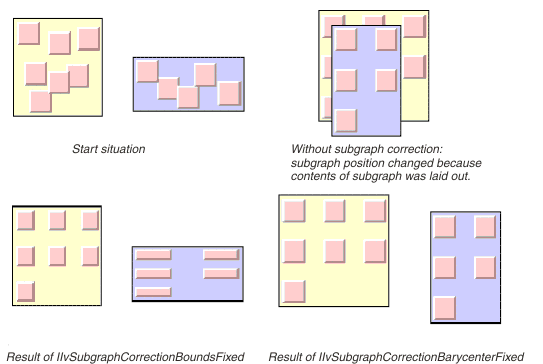 IlvSubgraphCorrectionBarycenterFixed corrects the subgraph so that after its contents has been laid out, the center of the subgraph remains the same. However, the size of the subgraph bounding box may change due to the contents layout.
