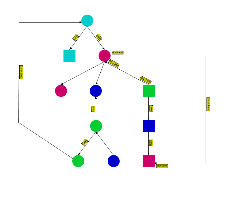 The “ Subobject#deco ” rule specifies the graphic properties of the label. This label has a special background color. The declaration “ decorationPositions[0] ” specifies where the label attaches the link. If the label layout renderer is disabled, the label is placed in a hard-coded way at this position. If the label layout renderer is enabled, the label is placed approximately at this position, but also tries to avoid overlaps with other labels or obstacles.