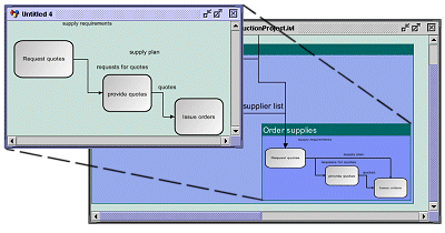 The IlvManager class inherits from the IlvGraphic class; as a consequence, a manager and a grapher can be added to another manager or grapher just like any other graphic object. To add a manager to a manager, you use the addObject method of the IlvManager class.