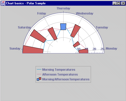 You are going to create a polar chart to represent the morning and afternoon mean temperatures. The days of the week will be represented along the abscissa and the temperatures along the ordinate. The abscissa values will be mapped along a circular scale and the ordinate values will be displayed radially. You will customize the scales and finally, you will add a legend to the chart.