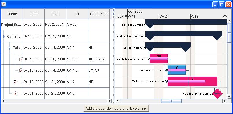 When you click Add the user-defined property columns, the example displays columns with the user-defined properties of the activities as shown in the next figure. Before clicking to display the columns for user-defined properties, you might want to adjust the width of the sample window, so that you can see the additional columns.