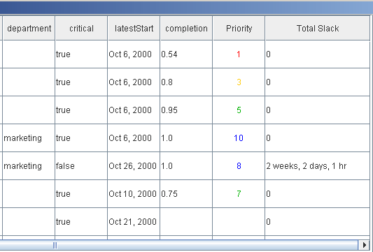 Instantiating a column with specific table cell editor and renderer shows how to instantiate a column with a specific table cell editor and a specific table cell renderer. You specify the cell editor as a slider and render the cell in different colors according to the priority of the activity or resource.