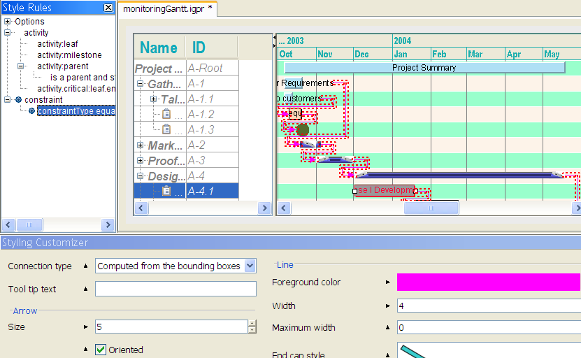 The following figure shows the changed styling, which is restricted to constraints on activities of type End-Start. Note that the black triangles beside the changed rendering properties that are specific to this rule point to the right to show that these settings are local to the current rule. The black triangles beside the other properties point upwards to indicate that those properties are inherited from the generic constraint rule.