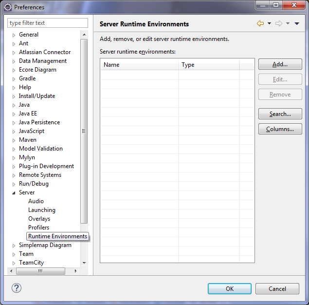 Select Windows>Preference>Server>Runtime Environments and click Add.