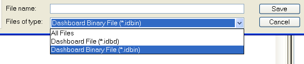 The Dashboard Editor supports two formats: XML (.idbd) and binary (.idbin).