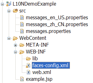 Add locale-specific message property files under the same folders as the message.properties files. For example, put messages_en_US.properties and messages_zh_CN.properties also under the Java src directory. These files are copied to your classes directory after compilation. The project hierarchy is shown in the following figure: