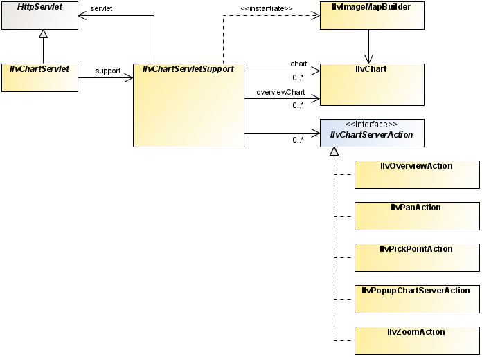 All the classes needed to build Web applications are contained in the ilog.views.chart.servlet package. The core classes of the framework are the abstract IlvChartServlet and IlvChartServletSupport classes. These classes are responsible for handling the HTTP requests received, and for sending the expected response according to the request parameters.