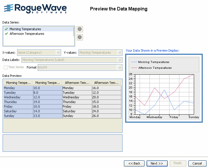Click one of the series in the Data Series table to see the corresponding mapping in the Data Preview table.