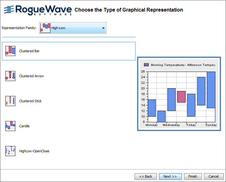 You are going to display the two sets of temperatures with two polylines and with a High-Low bar representation, which represents both the data sets of the morning and afternoon mean temperatures.
