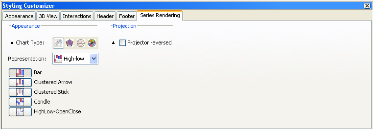 This representation displays the series as vertical or horizontal bars (orientation is determined from the chart projector configuration). It supports four representation modes: