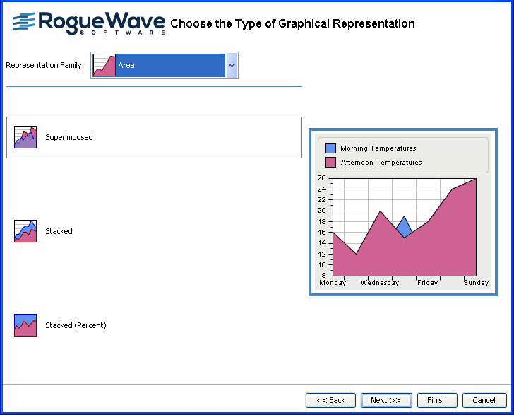 To better appreciate the 3-D rendering benefits, you are going to create a basic Cartesian chart and choose Area as graphical representation.
