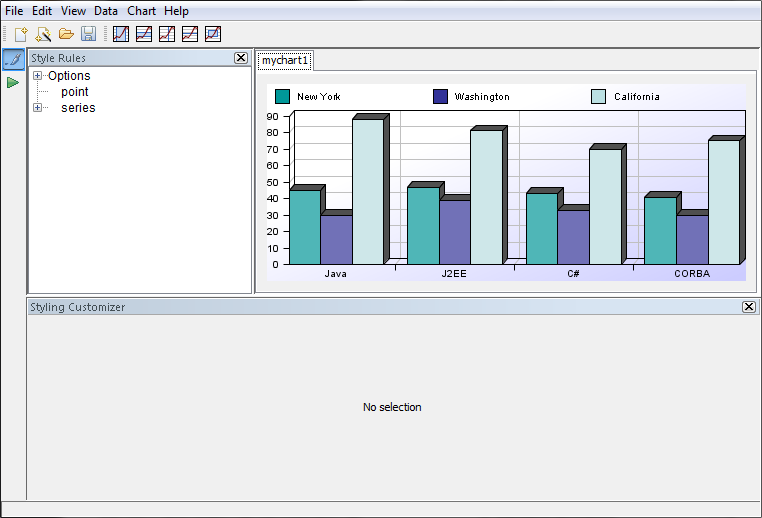 Your chart appears in the Designer with the style and data defined by the template you have selected. In this example you have selected the template “3D Vertical Bar”, your chart displays three series using 3D vertical bars ordered by category, as follows: