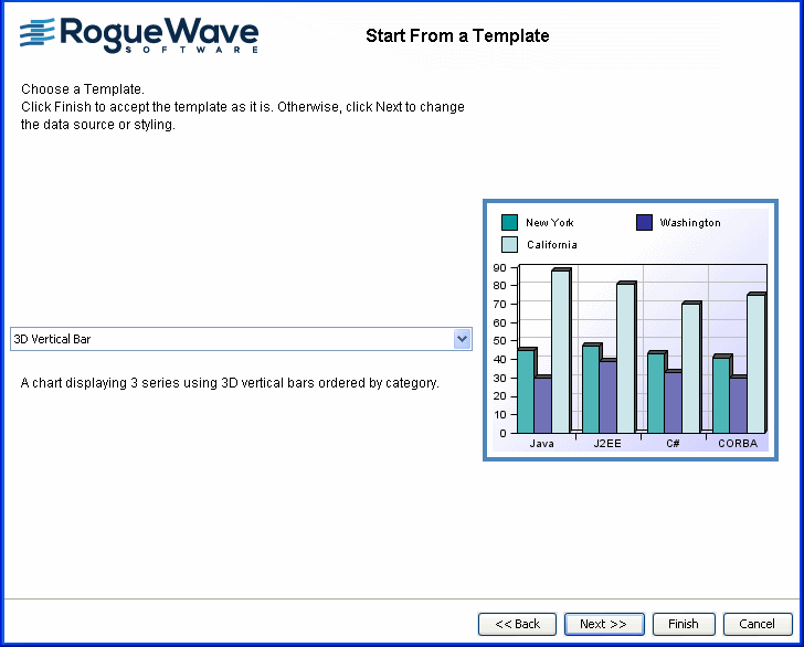Within the New Chart Wizard, you can use templates for creating your chart. A template is a predefined project which includes a style sheet designed for a specific type of application or style of presentation and an appropriate data model.