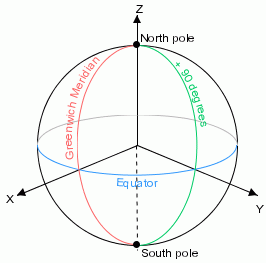 Its y-axis, which lies in the plane containing the equator and which is oriented towards the longitude 90 Degrees East of Greenwich.