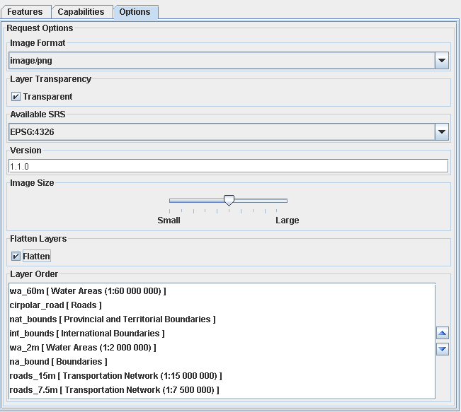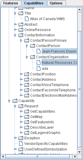 Click the Capabilities tab to display the Capabilities pane. The Capabilities pane shows the response from the server to the capabilities request. This pane is for information only and displays the layers that are available in the WMS data.
