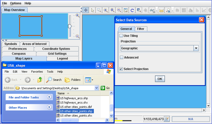 The following figure shows an example of dropping a shape file (.shp) into the main window. You are prompted to specify a projection.