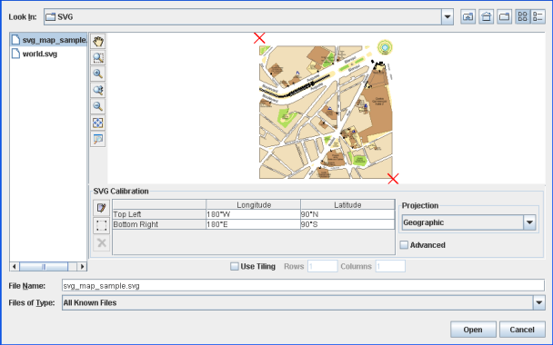 When loading images in GIF, JPG, PNG, or TIF format, the Map Builder scans the directory to see if a World file exists, and if so, predefines the image bounds accordingly in the importation dialog box.