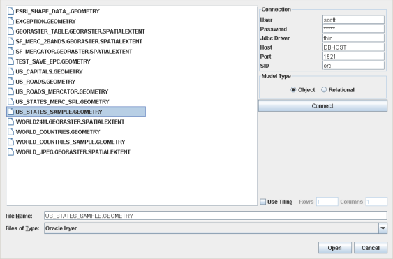 Select the model type of your database. In recent Oracle spatial databases, object model is the standard.