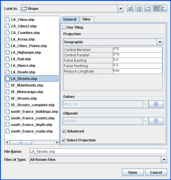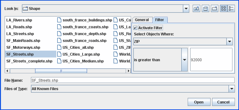 The following figure shows the definition of a filter which will only load San Francisco streets which have ZIP codes greater than ““92000””.