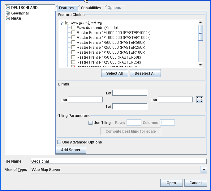 To use load-on-demand, select the Use Tiling check box and specify the number and lines and columns of tiles you want to divide the limits region (specified above) into. Given that WMS servers usually limit the image size of a request, this helps improve the overall region resolution by using the specified request image size per tile (one image request per tile load instead of a unique image request for the whole area of interest).